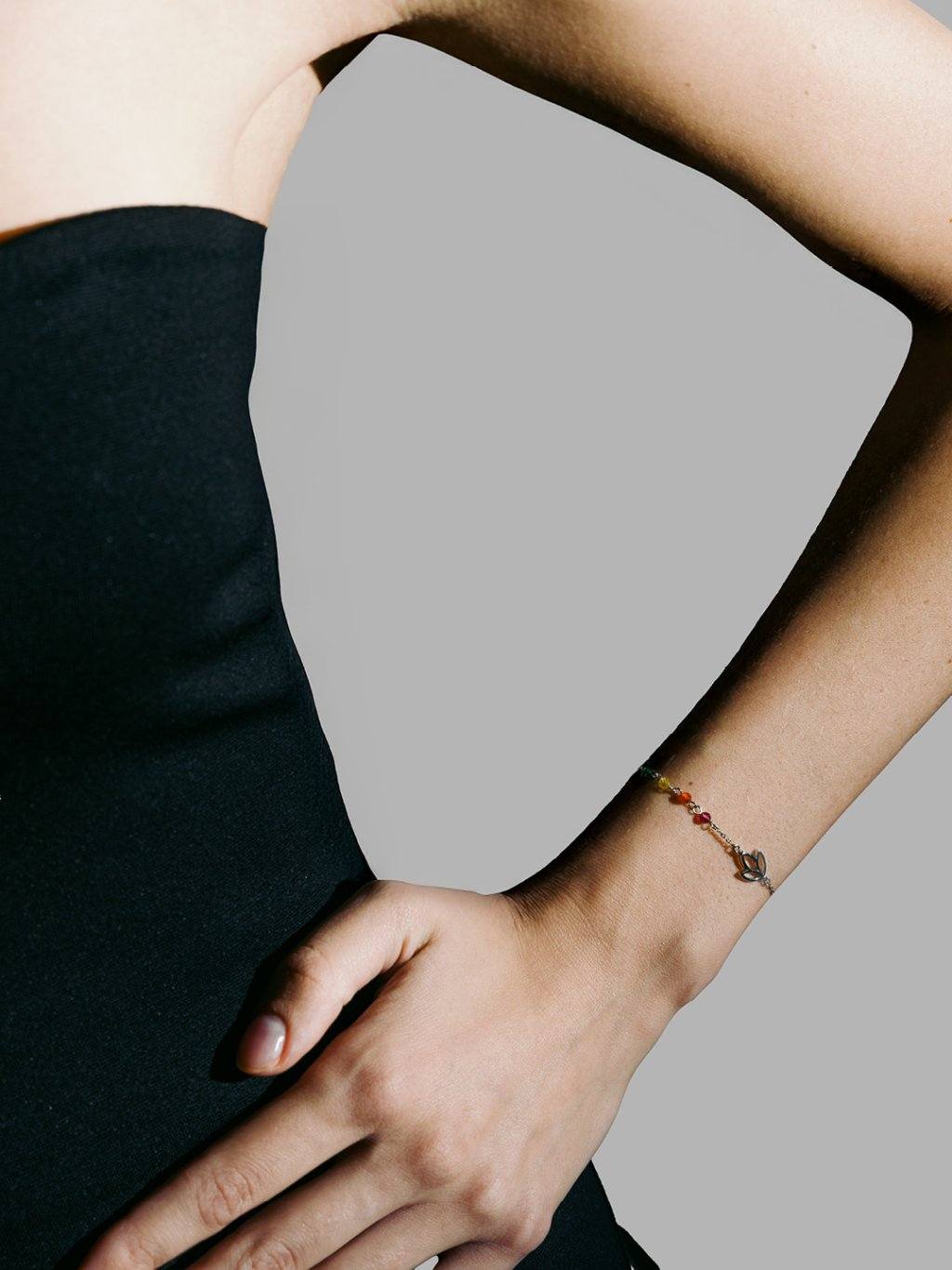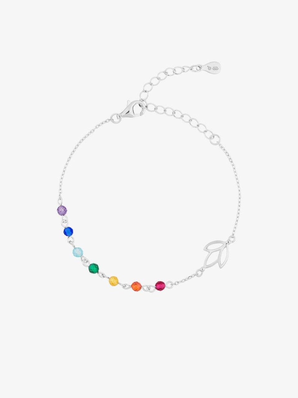 Puhtauden ja henkisen kasvun merkkinä oleva herkkä lootuskivi yhdistyy tässä rannekorussa seitsemän chakran väreissä olevaan riviin hiottuja zirkoniakiviä. Jokainen niistä kantaa omaa energiaansa - elinvoimasta ja voimasta luovuuteen, itseluottamukseen ja rakkauteen, intuitioon ja henkiseen tasapainoon.