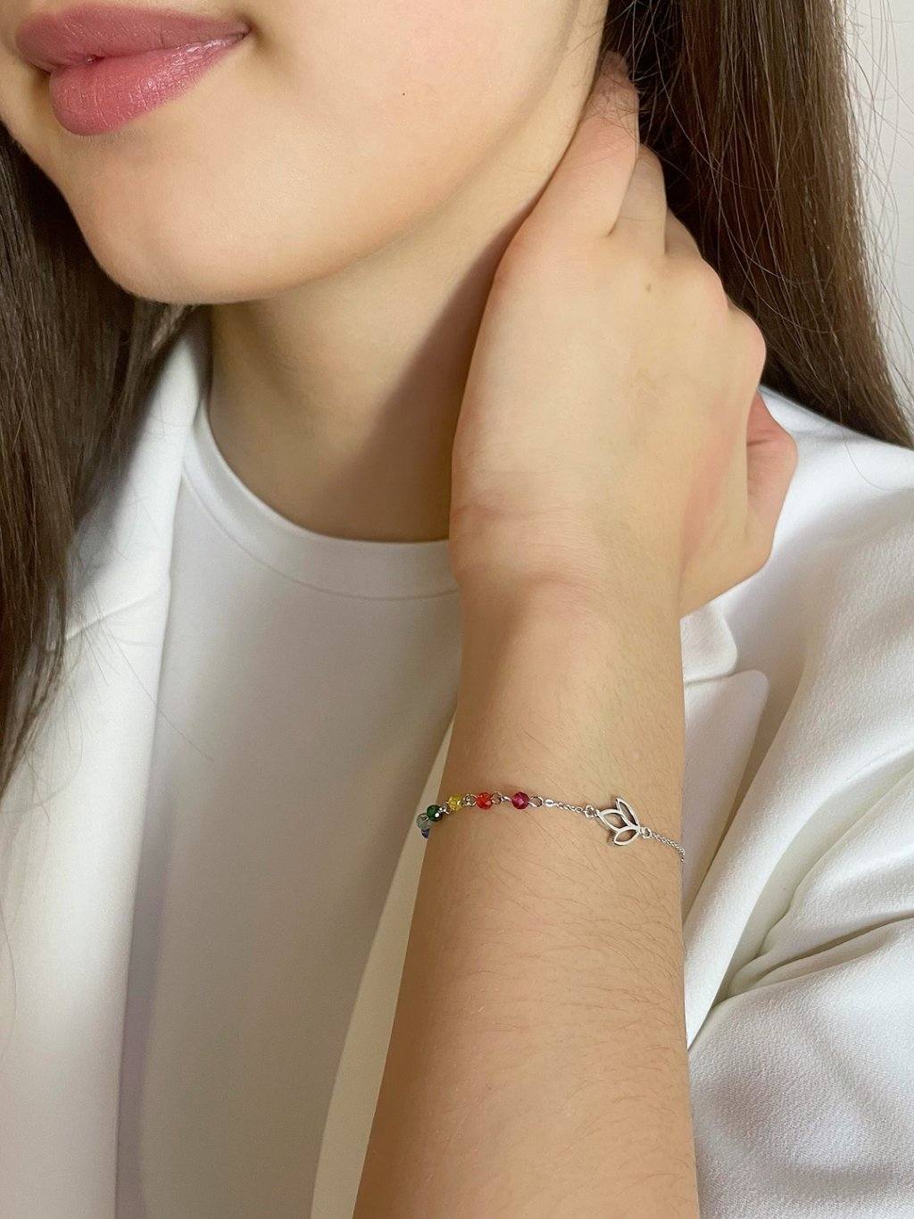 Zen hopeinen rannekoru on herkkä hopeinen rannekoru, jossa on lootuskuvio ja kuutiokiviä chakran väreissä. Se symboloi sisäistä rauhaa, harmoniaa ja henkistä tasapainoa. Tämän tyylikkään asusteen, joka toimii energian ja naisellisen voiman talismaanina, pituus on 15 cm, ja sitä täydentää 5 cm:n säätölaite, jonka avulla voit säätää rannekorun ranteesi leveyden mukaan.