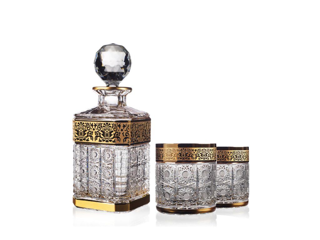 Bohemia Crystal käsin hiottu viskisetti (1 pullo + 2 viskilasia) päällystetty kullalla. Valmistettu lyijykristallista.